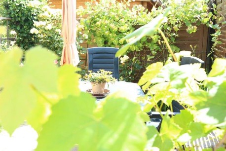 Die gepflegte Sitzecke im Freien lädt zum Verweilen ein.
